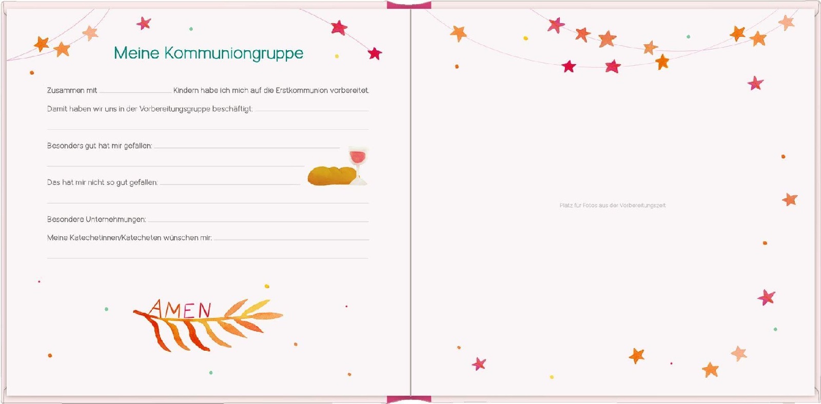 Dieses zauberhafte Eintragalbum begleitet das Kommunionkind und seine Gäste am Tag der Erstkommunion und bewahrt die schönsten Erinnerungen an diesen besonderen Moment. Der edle Perlmuttpapiereinband, der pinkfarbene Buchschnitt und die glänzenden Folienveredelungen machen es zu einem echten Blickfang. Im Inneren ist viel Platz für Fotos, persönliche Eintragungen und gute Wünsche. Ideal für Eltern, Paten oder Großeltern - als bleibende Erinnerung an das Kommunionsfest.