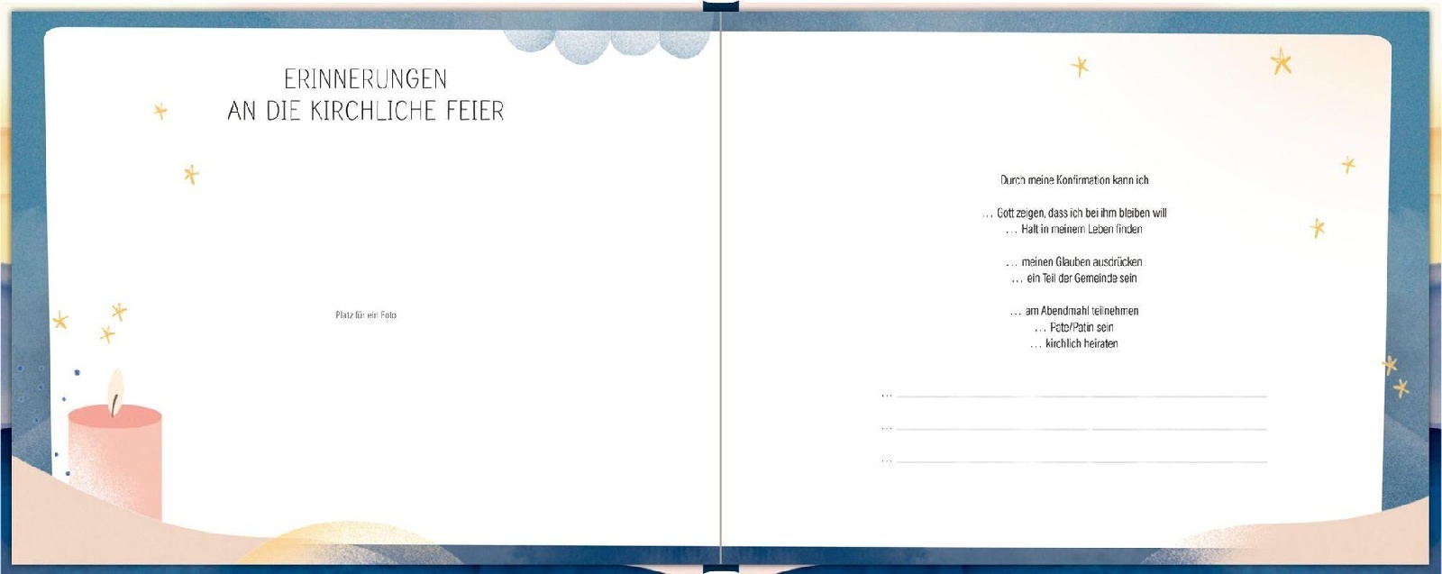 Dieses liebevoll gestaltete Album ist ein ganz besonderes Erinnerungsstück zur Konfirmation. Der edle Stoffeinband mit Folienveredelung und dunkelblauem Buchschnitt macht es zu einem hochwertigen Geschenk und bleibenden Andenken. Auf den liebevoll gestalteten Seiten ist reichlich Platz für Fotos, persönliche Eintragungen, Segenswünsche und Erinnerungen an diesen wichtigen Tag im Leben.